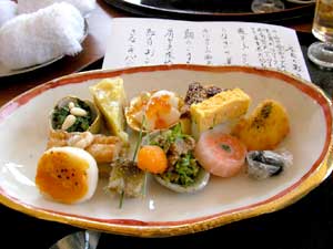 干し柿牛しゃぶ和え、大原木煮、みそ松風、二見卵、黒豆薄氷、